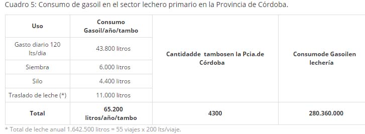En este caso tomo como base un tambo de producción media – 4000 litros / día – en el que tengo en cuenta el consumo de gasoil diario, el de siembra, hechura de silo y traslado de la leche (Cuadro 5).