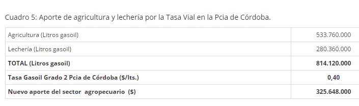 Teniendo en cuenta solo los rubros de agricultura y lechería el campo aportaría por Tasa vial en la provincia de Córdoba 325 millones de pesos: ¿Cuál sería el aporte del sector agropecuario (Agricultura y tambo)?