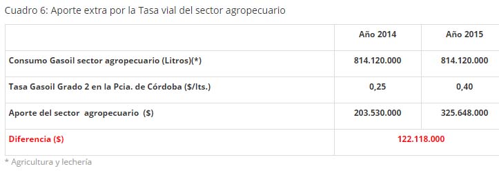 Si comparamos lo que aportará este año por la tasa vial (Cuadro 6) el sector agropecuario –teniendo en cuenta la agricultura y lechería- con lo que se recaudará en el 2015, el campo sufrirá una extracción extra de 122 millones de pesos.