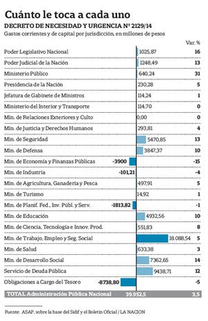 También hay casi $ 10.000 millones más para pago de deudas. Con las modificaciones introducidas y si se hacen todas erogaciones autorizadas, el gasto total será 32,3% mayor que el previsto en la ley de presupuesto 2014 cuando la aprobó el Congreso. En agosto último ya habían aumentado las erogaciones previstas para el presente ejercicio en nada menos que $ 200.000 millones, llevándolos bien por encima del billón, un récord absoluto.