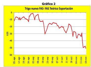 Esto se observa en el gráfico 2, donde se advierte que la brecha entre el valor de mercado y el FAS teórico se encuentra en un máximo de U$S 50, muy por encima de lo vislumbrado a comienzos de septiembre cuando estaban casi en paridad.