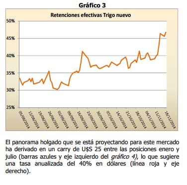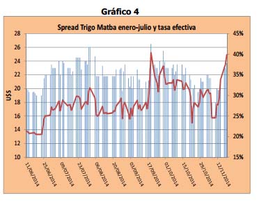 El panorama holgado que se está proyectando para este mercado ha derivado en un carry de U$S 25 entre las posiciones enero y julio (barras azules y eje izquierdo del gráfico 4), lo que sugiere una tasa anualizada del 40% en dólares (línea roja y eje derecho).