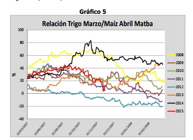 Si bien a nivel local el maíz ya ha estado más caro que el trigo en el pasado, citando los ejemplos de 2011 y 2012 (líneas violeta y celeste en forma respectiva), no existe demasiado margen para que este ratio caiga mucho más, lo cual puede brindar soporte al trigo en la primera parte de 2015.