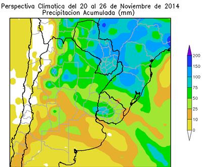 El aporte de calor y humedad, producido por los vientos del norte producirá precipitaciones de frente caliente, o sea sin que baje la temperatura, sobre la mayor parte del área agrícola: La mayor parte del NOA, la mayor parte del Paraguay, el este de la Región Pampeana y el norte y el sudoeste del Uruguay observarán precipitaciones abundantes a muy abundantes (25 a 75 mm), con posibles focos de tormentas severas. El resto del área agrícola, observará precipitaciones moderadas a escasas (menos de 25 mm).