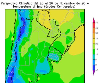 La mayor parte del Paraguay, el este del NOA, la mayor parte de la Región del Chaco, el norte de Cuyo y el noroeste de Córdoba, observarán temperaturas mínimas superiores a 15°C. Con un foco con temperaturas superiores a 20ºC. El centro del NOA, el este de la Región del Chaco, la mayor parte de la Mesopotamia, la mayor parte de la Región Pampeana, el este de Cuyo, el sudeste del Paraguay y el noroeste y el este del Uruguay observarán temperaturas mínimas entre 10 y 15ºC.