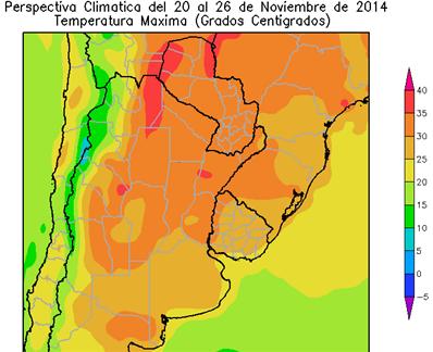 A mediados de la primera etapa de la perspectiva, retornarán los vientos del norte, provocando temperaturas máximas superiores a lo normal en gran parte del área agrícola: La mayor parte del norte y el centro del área agrícola registrará temperaturas máximas superiores a 30ºC, con núcleos cálidos con temperaturas superiores a 35ºC. El centro del NOA, el centro de Cuyo, el nordeste de Misiones, la mayor parte de la Región Pampeana y la mayor parte del Uruguay, observarán temperaturas máximas entre 25 a 30ºC.