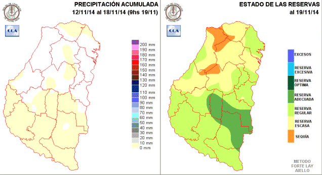 Se insinúa un estado de sequía en el norte del departamento La Paz, el cual seguramente es posible que se generalice temporariamente a los departamentos con reservas escasas, los cuales mínimamente quedan vulnerables a esta condición de exigencia, de no mediar lluvias de buen porte en los próximos diez días. En el corto plazo los departamentos del norte, podrían recibir algunas lluvias que decantan desde el sur de Corrientes donde podría concentrarse la actividad en las próximas horas. Par el resto del territorio, la oportunidad de un nuevo episodio pluvial, hay que esperarla hasta mediados de la semana próxima.