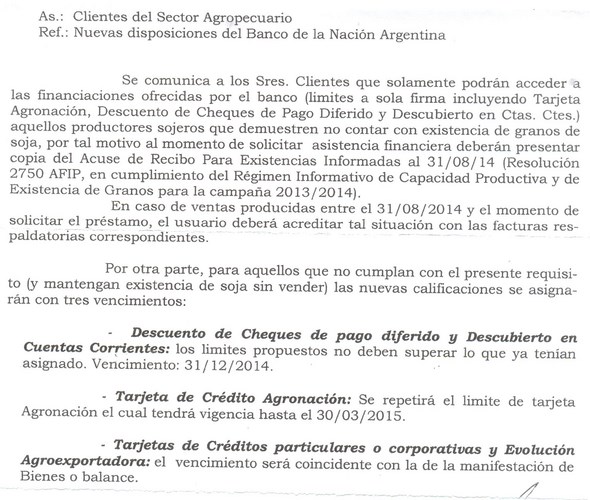 Jamas un Banco de fomento a la producción , como es el caso del Banco de la Nación Argentina ha impuesto tan disparatadas restricciones, ya que si el propósito es conocer la real existencia de granos de soja en el país, existen otros mecanismos y organismos para tal fin.