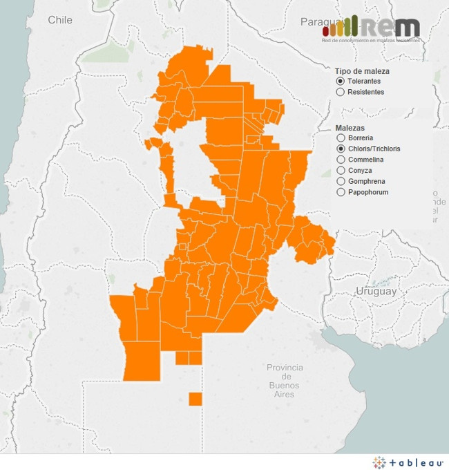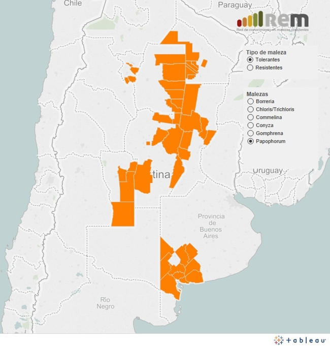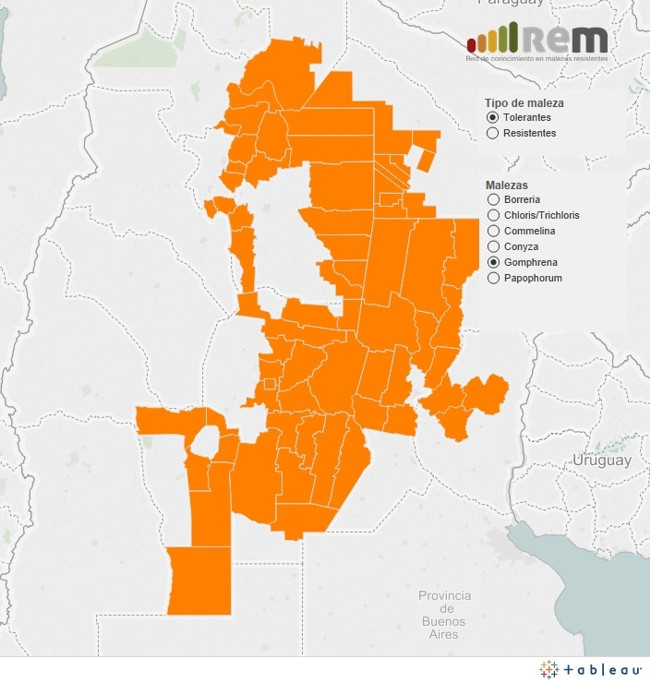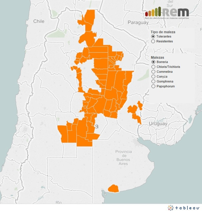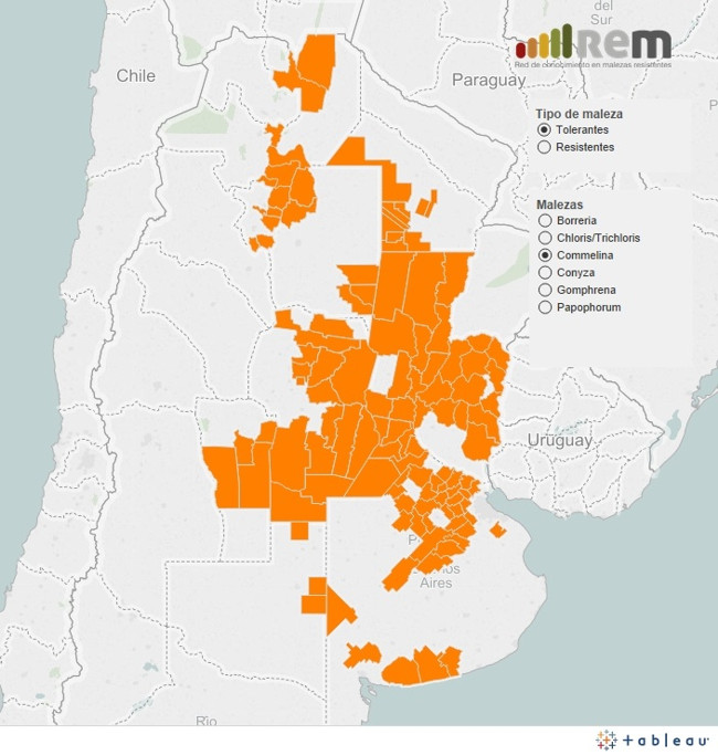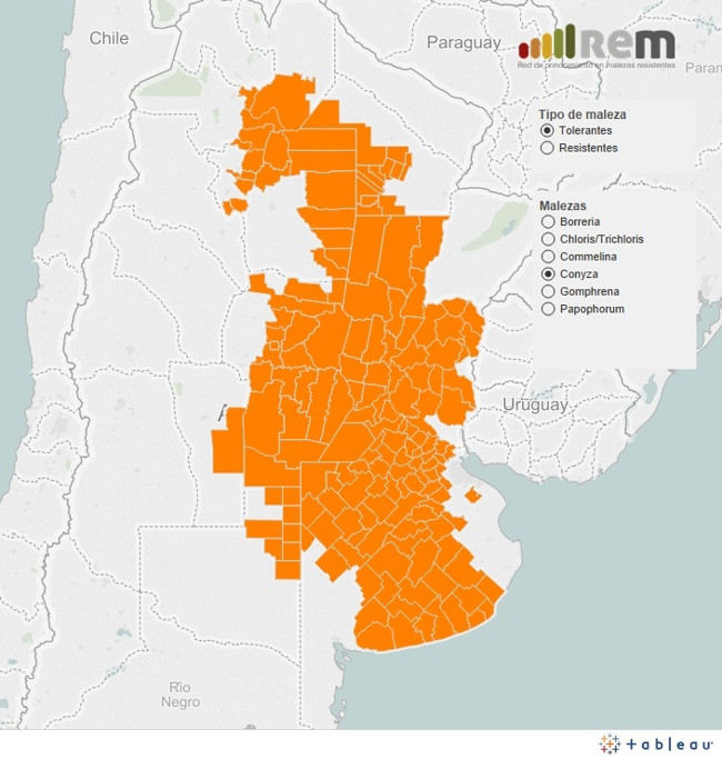 Al momento, se mapearon seis grupos de especies: Conyza sp. (Rama negra), Gomphrena sp. (Siempre viva), Borreria sp. (Botoncito blanco), Chloris y Trichloris sp. (Gramas), Papophorum sp. y Commelina erecta (Flor de Santa Lucía). La metodología utilizada fue la misma que para los mapas de malezas resistentes, con consultas a técnicos de cada partido o departamento del área con mayor porcentaje de agricultura extensiva del país, esto es, las provincias de Salta, Tucumán, Chaco, Santiago del Estero, Santa Fe, Córdoba, Entre Ríos, Buenos Aires, La Pampa y San Luis. En total se relevaron 178 departamentos y partidos de estas diez provincias. Luego esta información se validó con especialistas de cada zona. Es importante aclarar que mapear determinado departamento no significa que toda su superficie agrícola presente esta maleza, sino que se detectó su presencia, ya sea en algunos o muchos lotes pero, como el objetivo es la prevención, resulta fundamental indicarlo, aunque se trate de pocos focos.