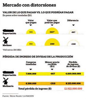 La distorsión ocurre por la política de cuotificación de las exportaciones del Gobierno. Hace tres semanas autorizó la venta de 1,5 millones de toneladas del ciclo 2014/2015 (1,2 millones de toneladas de grano y 300.000 toneladas de harina), volumen que en el sector consideran insuficiente para que haya una competencia activa entre molinos y exportadores y esto se refleje en mejores precios.