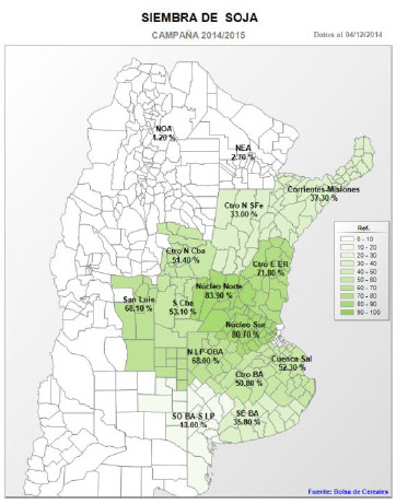 A la fecha la siembra nacional logró cubrir el 98,4 % de la superficie prevista en 1.300.000 hectáreas, permitiendo calcular un avance intersemanal de sólo 1,6 puntos porcentuales, pero todavía manteniendo un adelanto de 1,5 puntos porcentuales respecto al ciclo previo. La superficie aún pendiente de siembra equivale a tan sólo 20 mil hectáreas, concentradas principalmente en sectores del Sudeste de Buenos Aires, en donde las lluvias del pasado fin de semana interrumpieron la incorporación de lotes.