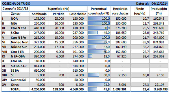 Hacia el sur, la recolección comenzó a cobrar fluidez también sobre el Norte de La Pampa y el Oeste de Buenos Aires y ello permitió elevar el rinde medio durante esta semana a 38,4 qq/Ha en la región, superando las expectativas iniciales.