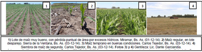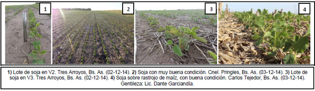 Finalmente, sobre el Norte de La Pampa y Oeste de Buenos Aires los cuadros más desarrollados expanden entre cuatro a cinco hojas (V4-V5), pero en promedio la mayor cantidad de lotes aún presentan sólo tres hojas (V3). Pese a esto, aún existe una gran proporción de hectáreas recientemente sembradas, que transitan etapas de siembra/emergencia. En términos generales, la condición del cultivo varía de buena a muy buena, sostenida por una adecuada oferta hídrica, pero con algunos lotes encharcados en sectores bajos, debido a la combinación de fuertes lluvias y napas freáticas con niveles elevados.