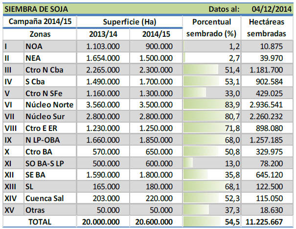 En números absolutos se han sembrado más de 11,2 MHa en toda el área agrícola, y desde nuestra anterior publicación, la actividad de siembra se concentró sobre el Centro-Norte de Córdoba y Santa Fe, sectores del Núcleo Sur, del Norte de La Pampa y del Oeste y Sudeste de Buenos Aires.