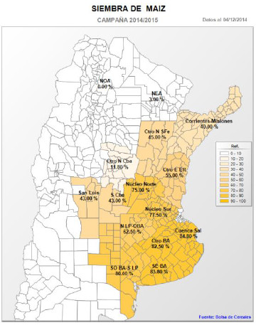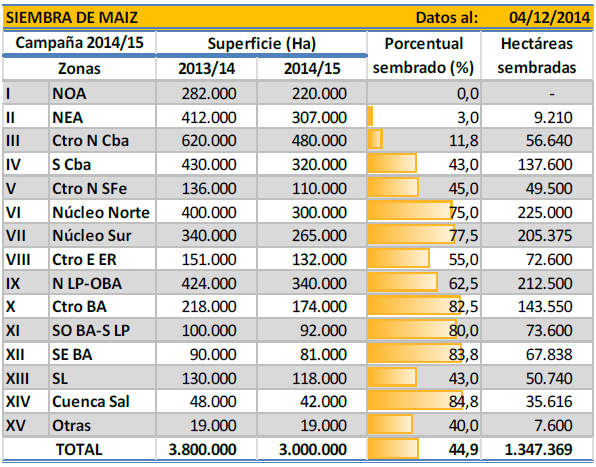 Al presente informe, la siembra nacional de maíz, con destino grano comercial, logró cubrir el 44,9 % de la superficie estimada en 3.000.000 de hectáreas, permitiendo calcular una progreso intersemanal de 3,5 puntos porcentuales y un retraso interanual de -2,5 puntos porcentuales. En números absolutos, ya se han sembrado más de 1,3 MHa y la mayor actividad de siembra se concentró sobre el Norte de La Pampa, Oeste y Centro de Buenos Aires, en donde se comenzaron a incorporar cuadros correspondientes a fechas de siembra tardía. Simultáneamente, la incorporación de lotes también correspondientes a fechas tardías comienza a agilizarse en la provincia de Córdoba y en sectores del Núcleo Sur, en ambos casos impulsada por la muy buena oferta hídrica disponible en los cuadros.