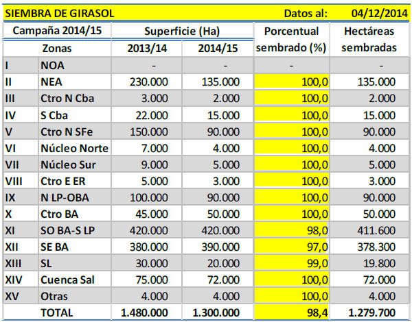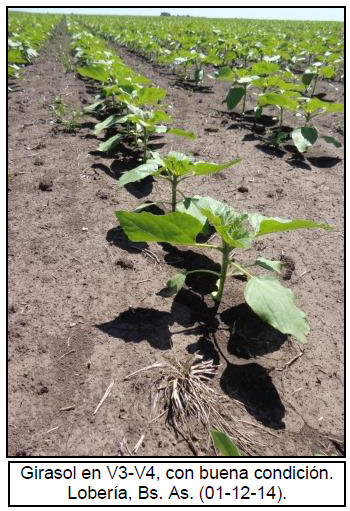 Sobre el norte del área agrícola nacional, más precisamente en el núcleo girasolero ubicado en la región NEA, la mayor proporción de lotes se encuentra llenando grano y algunos cuadros aún retrasados transitan etapas de botón floral. La condición del cultivo varía de normal a muy buena, gracias a la recuperación lograda luego de las lluvias acumuladas durante noviembre, lo cual permite registrar hoy en día una condición hídrica entre adecuada y óptima. La expectativa de rinde en la región se ubica en 18 qq/Ha, por encima del promedio registrado durante las últimas siete campañas.