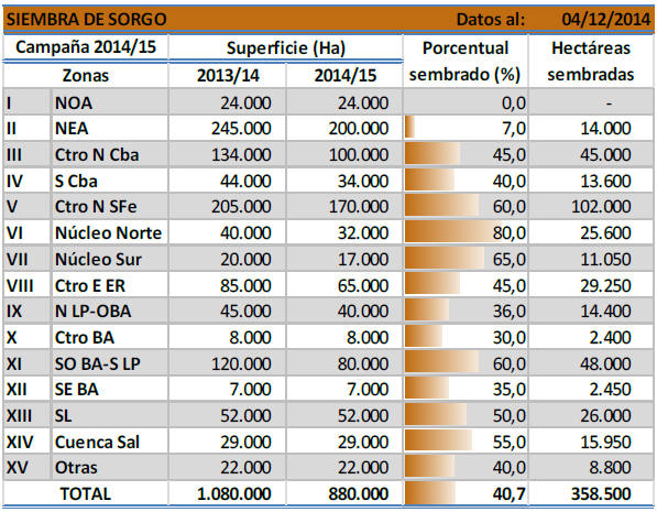 Por último, en la región Sudoeste de Buenos Aires y Sur de La Pampa la siembra de sorgo avanza firmemente, sostenida por la buena disponibilidad hídrica en los cuadros. En esta región hay buenas expectativas para la trilla de sorgo granífero, y esto se debe a la buena disponibilidad de forraje para los consumos zonales que liberaría buena parte de los materiales doble propósito para ser cosechados.