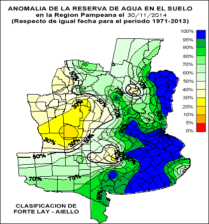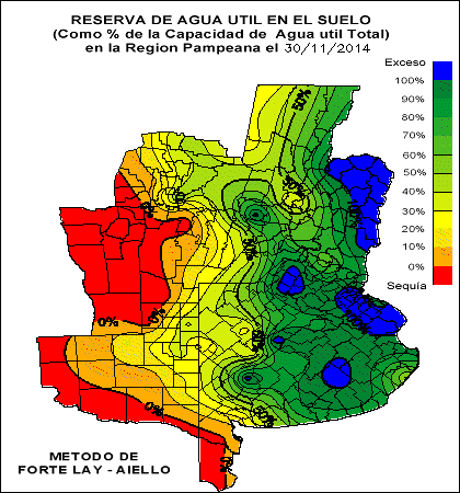 RESERVA DE AGUA ÚTIL EN EL SUELO (como % de la capacidad de agua útil total) en la Región Pampeana el 30 de Noviembre de 2014