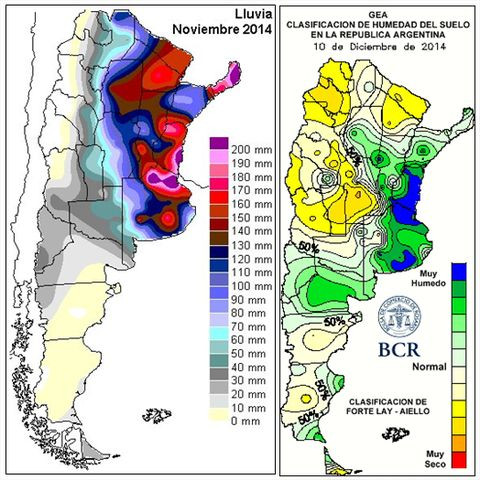 Pese a los problemas de excesos, las últimas lluvias alcanzaron las zonas más mediterráneas y fueron sumamente oportunas para el avance de la siembra de soja. Se estima un 63% implantado sobre un área de intención de 20,7 millones ha para la oleaginosa en el ciclo 2014/15.