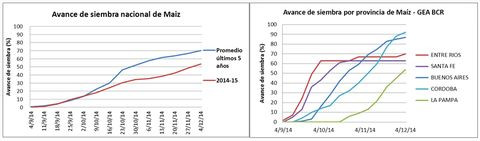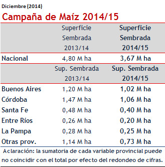Con 60% de la superficie de intención ya implantada, se mantiene la estimación para la superficie sembrada de maíz 2014/15 en 3,7 millones de ha. Subsiste la posibilidad de ajustes posteriores en la medida que avancen las labores de siembra de diciembre. De confirmarse este guarismo como cifra final, la caída en la superficie sería de un 23,5% respecto de su ciclo anterior.