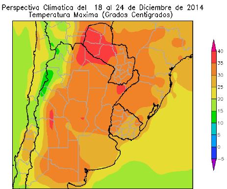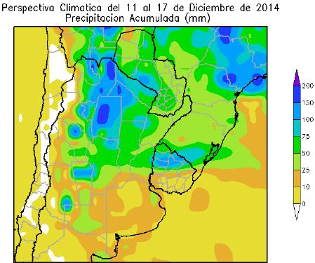 La perspectiva comenzará con la entrada de vientos del sector sur, que causarán un descenso térmico que afectará especialmente al litoral atlántico de la Argentina y el Uruguay, mientras que el resto del área agrícola seguirá bajo la influencia de los vientos cálidos del trópico. Posteriormente, los vientos del sector norte volverán a hacer sentir su influencia sobre la mayor parte del área agrícola, aportando abundante humedad atmosférica y nubosidad, e incrementando la temperatura. Hacia el final de la perspectiva, el paso de un frente cálido, producirá precipitaciones abundantes a muy abundantes sobre el norte y el centro del área agrícola, mientras que el sur de la misma registrará precipitaciones moderadas a escasas.