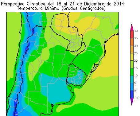 La mayor parte del Paraguay, el este del NOA, la Región del Chaco, el noroeste de Corrientes, el norte de Cuyo, el norte de Santa Fe y el noroeste de Córdoba, observará temperaturas mínimas superiores a 20ºC. El sudeste del Paraguay, el centro del NOA, la mayor parte de Cuyo, la mayor parte de la Mesopotamia, el norte y el sur de la Región Pampeana y el noroeste y el nordeste del Uruguay, observarán temperaturas mínimas entre 15 y 20ºC.