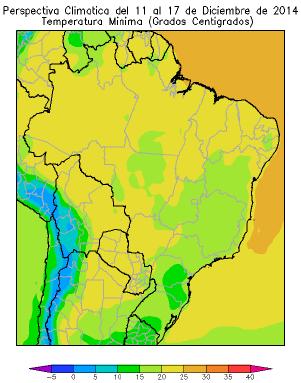 El sur de Pará, el sur de Tocantis, el sur de Piauí, el norte y el sudeste de Mato Grosso, el nordeste y el sudeste de Mato Grosso do Sul, la mayor parte de los Estados de Goias, Bahia, Mina Gerais, Sao Paulo, Paraná, el oeste de Santa Catarina y la mayor parte de Río Grande do Sul, registrarán temperaturas mínimas entre 15 y 20ºC.