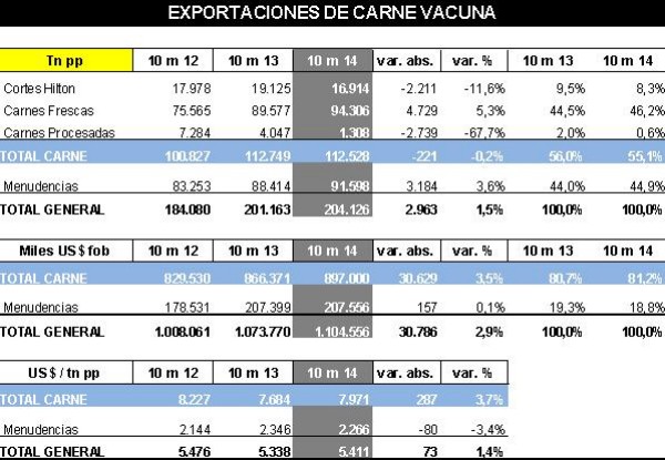 En octubre de 2014 las exportaciones de carne vacuna ascendieron a 13.940 toneladas peso producto (tn pp), marcando el tercer nivel más alto del año (quedando sólo por debajo de los registros de julio y agosto, que se aproximaron a las 15 mil tn pp). En cambio, en octubre del año pasado se registró uno de los volúmenes más bajos de aquel ejercicio. De este modo, las exportaciones certificadas durante octubre de 2014 fueron 41,3% mayores en términos interanuales, acumulando cinco meses consecutivos de crecimiento, luego de cuatro meses en los que cayeron a un ritmo promedio de 21,4% anual. En los primeros diez meses del año se exportaron 112.528 tn pp de carne vacuna, reduciéndose la caída acumulada a 0,2% anual.