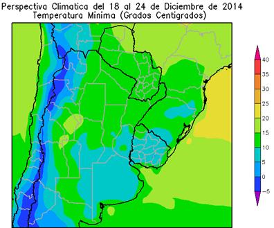 Hacia mediados de la segunda etapa de la perspectiva, se producirá un moderado descenso de la temperatura, que proveerá una pausa en la ola de calor. La mayor parte del Paraguay, el este del NOA; el norte de la Región del Chaco, el norte de la Mesopotamia, el norte de Córdoba, el centro de Cuyo y el noroeste y este del Uruguay, observará temperaturas mínimas superiores a 15ºC, con un foco cálido de 20ºC, sobre el noroeste del Paraguay.