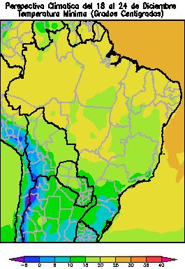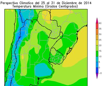 Hacia el final de la perspectiva, los vientos rotarán al sector sur durante un breve lapso, determinando un marcado descenso de la temperatura, en la mayor parte de la Región Pampeana, mientras que el centro y el norte observarán valores moderados. Gracias a este proceso, es probable que la mayor parte de La Argentina, el Paraguay, el sur del Brasil y el Uruguay puedan festejar las Fiestas Navideñas con tiempo fresco y despejado. Por su parte, Bolivia y el centro y el norte del Brasil lo harán en medio de tormentas severas.