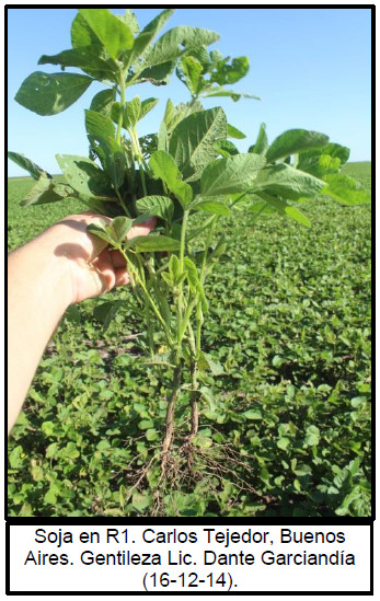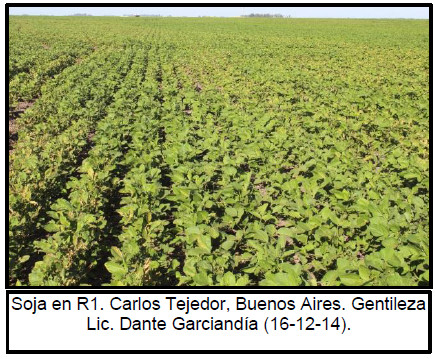 En términos generales los cuadros implantados en fechas tempranas sobre el centro de la región agrícola, en su gran mayoría aún se encuentran transitando etapas vegetativas y a excepción de los sectores comprometidos por déficit hídrico recién mencionados, el resto del área mantiene una condición de cultivo que varía de buena a muy buena. Puntualmente sobre el Núcleo Norte se relevó presencia de isoca bolillera en varios lotes, aunque en muchos de ellos aún no se alcanzaba el umbral de daño que justifique su control. Distinto es el caso sobre la región Núcleo Sur, en donde una mayor presencia de estas isocas ya justificó en varios casos la aplicación de insecticidas, para controlar el ataque e impedir mayores daños sobre cuadros que aún mantienen una muy buena condición del cultivo. Sobre ambos Núcleos productivos también se relevó escape de malezas, en algunos casos como consecuencia a las frecuentes lluvias que imposibilitaron realizar controles en tiempo y forma. Hacia el Centro-Este de Entre Ríos también se relevó resiembras de varios lotes debido a la muerte súbita (dumping off) durante el nacimiento o como resultado del anegamiento de cuadros durante las etapas de implantación del cultivo. En esta última región también se registró problemas con isocas y escapes de malezas en varios lotes.