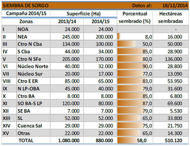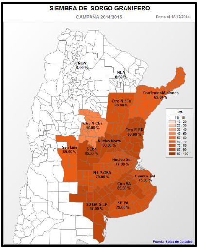 Continúan las labores de cobertura de sorgo granífero. A la fecha se llevan implantadas 510.000 Ha, representando un 58,0 % de la superficie nacional destinada al cultivo, tentativamente estimada para esta campaña en 880.000 hectáreas. Calculamos un progreso quincenal de 17,3 puntos porcentuales, mientras que la variación interanual de avance marca un retraso de -9 puntos. Con excepción de eventos puntuales, todos los cuadros implantados con anterioridad presentan un estado que va de bueno a muy bueno.