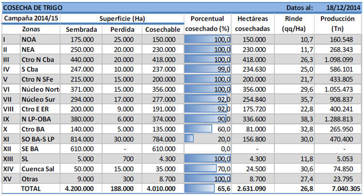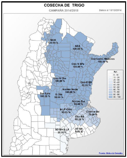 Finalmente, es importante aclarar que el 90 % de las 1,4 MHa aún pendientes de cosecha corresponde a cuadros ubicados sobre los núcleos trigueros del Sudoeste y Sudeste de Buenos Aires. Si bien la primera de estas dos regiones ya dio inicio a la recolección registrando muy buenos rendimientos, habrá que esperar a que la cosecha cobre impulso para definir con precisión la producción nacional prevista para el cierre de campaña.