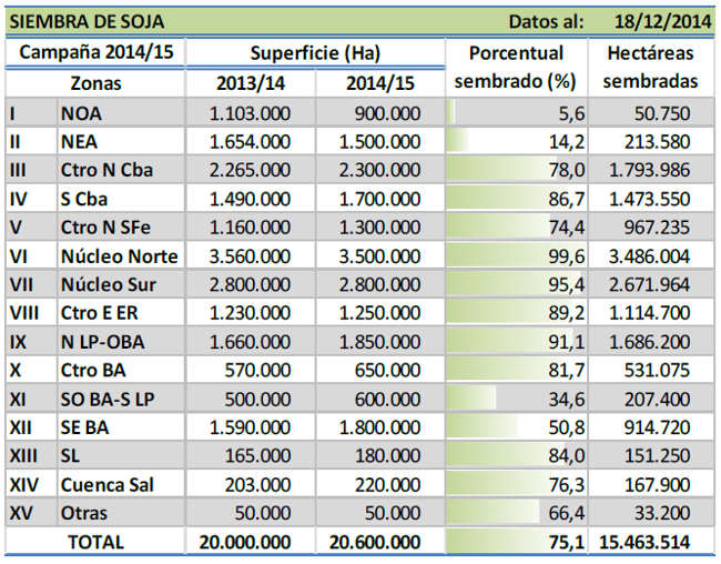 Este fuerte progreso para los últimos quince días fue impulsado por las siembras en el Sur de Córdoba, Entre Ríos y la provincia de Buenos Aires. Otras regiones que han registrado avances son el Centro-Norte de Santa Fe y el NEA, los cuales han iniciado las labores de implantación con los primeros lotes de fecha tardía. Los cuadros implantados en el Centro-Norte de Santa Fe en fechas tempranas hoy, se encuentran con hasta 8 hojas desplegadas y en muy buenas condiciones.