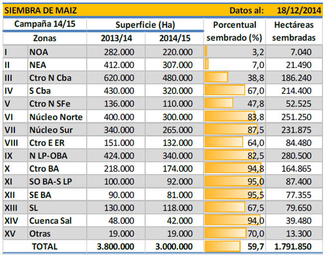 La siembra de maíz con destino grano comercial alcanzó un progreso intersemanal 7,9 puntos porcentuales, permitiendo así elevar el área actualmente cultivada a más de 1,7 MHa, cifra que representa un 59,7 % de las 3.000.000 hectáreas proyectadas para la campaña en curso. El actual avance de siembra permite calcular un retraso interanual de 5,5 puntos.