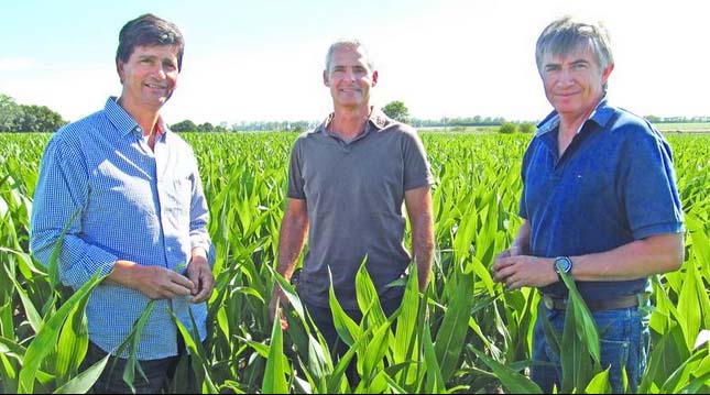 En el maíz. El cultivo es todo un símbolo de una agricultura más sustentable, que hoy falta. De izq. a der., en Pergamino, Oviedo Bustos, Dall’ Orso y Barberis.