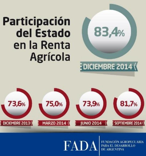 La participación del Estado en la renta agrícola alcanza el 83,4%, por conceptos de derechos de exportación, impuestos nacionales, impuestos provinciales y costos de intervención. Es decir, que de cada $100 que produce una hectárea promedio en Argentina, ponderando la participación de los cultivos de soja, maíz, trigo y girasol, $83,40 se los lleva o los reasigna el Estado con sus políticas.