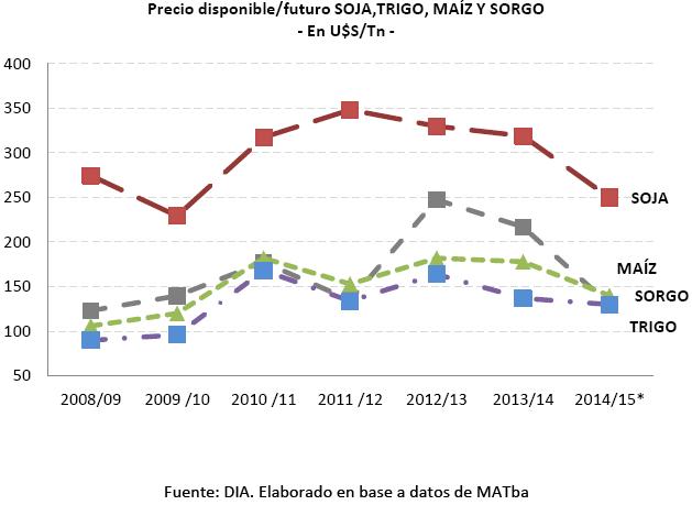 La producción estadounidense y las expectativas de una voluminosa cosecha en América del Sur (atentos al desarrollo climático en los próximos meses claves para el cultivo), más allá de una demanda sólida, mantiene deprimido los precios de la oleaginosa. Además, la relación stock/consumo se encuentra en los niveles más altos de los últimos años, lo cual implica una menor presión sobre la demanda. El precio en Chicago en la posición Mayo 2015 se ubica en torno a los U$S 390, muy por debajo de U$S 545 en Mayo de 2014. En los mercados a términos locales los contratos para la misma fecha se negocian a U$S 250/tn, casi U$S 70 menos que en Mayo de 2014.
