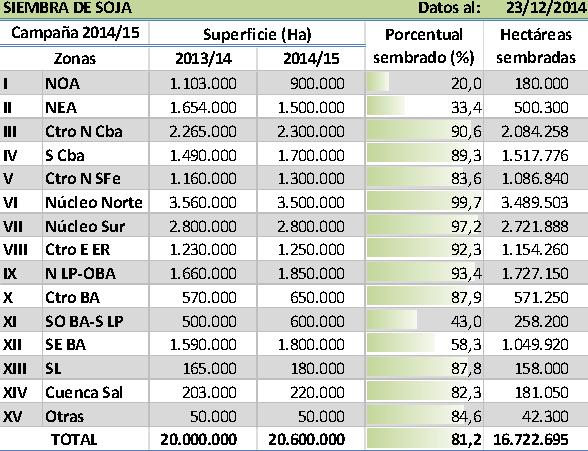 Luego de registrar un avance de 6,1 puntos porcentuales durante los últimos cinco días, la siembra nacional logró cubrir el 81,2 % de la superficie proyectada en 20.600.000 hectáreas. Desde nuestra anterior publicación, los mayores progresos en la incorporación de lotes se concentraron en las provincias del norte, más precisamente en las regiones NOA y NEA, seguidas por el Centro-Norte de Córdoba y Santa Fe. A la fecha se estima que el 89 % de la soja de primera ya fue implantada a nivel nacional, mientras que la soja de segunda cubrió el 51% de su estimación de superficie para el presente ciclo. En números absolutos ya se han sembrado más de 16,7 MHa en toda la región agrícola nacional.