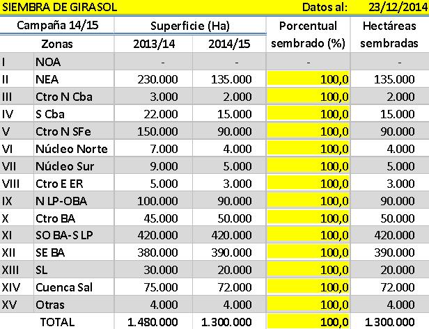 La estimación de área implantada con girasol es de 1.300.000 hectáreas para la campaña en curso. Durante la última semana continuaron con la trilla de lotes puntuales en el extremo noreste del área agrícola nacional. Si bien las lluvias caídas en las últimas horas sobre la provincia del Chaco y el norte santafecino han frenado dichas tareas, se espera que en los próximos días se retomen las labores de recolección. No obstante, las productividades obtenidas hasta el momento promedian los 15 qq/Ha, con picos que van desde los 12 a los 20 qq/Ha.