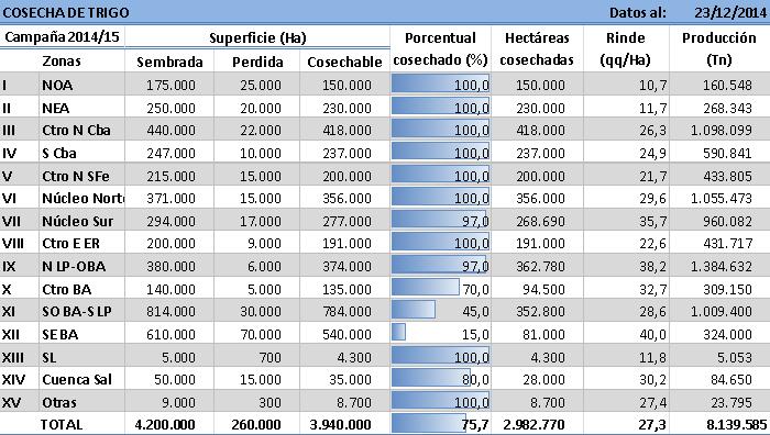 Durante los últimos cinco días, las buenas condiciones climáticas relevadas en gran parte del sector sur de la región agrícola, permitieron registrar un progreso de cosecha de 10,1 puntos porcentuales, elevando la recolección nacional al 75,7 % de la superficie apta. El rinde promedio país ascendió a 27,3 qq/Ha y luego de recolectarse poco menos de 3,0 MHa, el volumen parcial acumulado superó las 8,1 MTn. Al presente informe, más del 90 % de la superficie aún pendiente de cosecha corresponde a lotes en pie de los núcleos trigueros, ubicados sobre el sur de Bueno Aires, y se prevé que una vez finalizada la recolección la producción nacional ascienda a 11.500.000 toneladas.