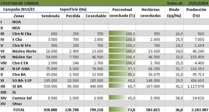 Fluidos progresos en las principales regiones cebaderas permiten que la cosecha a nivel nacional avance significativamente. A la fecha el progreso nacional en la trilla se calcula en 73,0 % de la superficie apta, lo que en números absolutos son unas 584.000 Ha aproximadamente. El análisis interanual arroja un retraso de -5 %. El rendimiento promedio a la fecha es de 36 qq/Ha y refleja un incremento de 2,9 qq/Ha desde nuestra última publicación, debido al importante ingreso de cuadros de la región Sudeste de Buenos Aires. A nivel nacional el volumen acumulado en chacra asciende a las 2,1 Mtn.