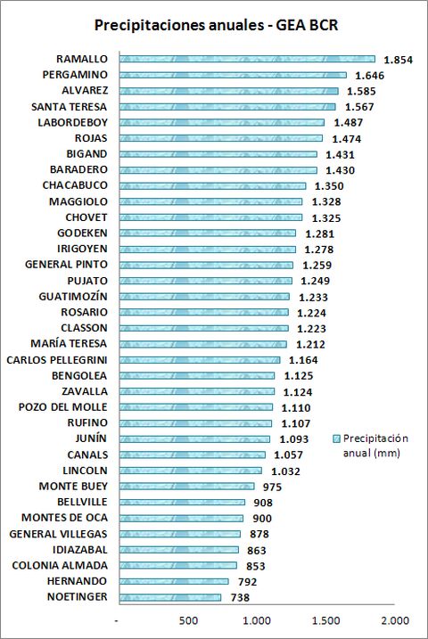 Las excesivas lluvias fueron noticia durante gran parte del año: dejaron caminos intransitables, incrementaron los niveles de napas, produjeron anegamientos prolongados y caída de rindes. En el primer puesto del ranking está la localidad de Ramallo que recibió el máximo acumulado con 1854 mm. Le siguen Pergamino con 1646 mm, Álvarez con 1585 mm y Santa Teresa con 1567 mm.