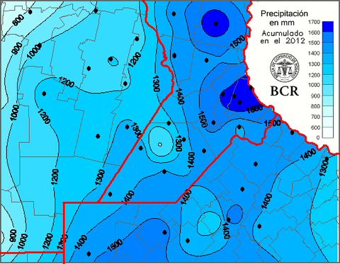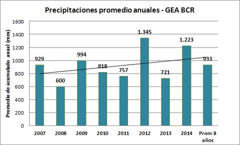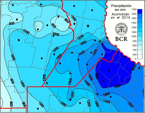 2014 fue “llovedor” pero, a diferencia del 2012, las precipitaciones se concentraron en el este de la región. Ramallo alcanzó los 1854 mm de registro pluviométrico anual, mientras que el resto del noreste bonaerense, las localidades superaban los 1600 mm. El sureste santafesino tuvo acumulados cercanos a los 1500 mm.
