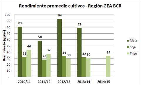 Es interesante efectuar el análisis en función del año agrícola (julio-junio). Se podrá apreciar que el mayor acumulado ocurrió en la campaña 2012/13. Justamente, el rinde del maíz copia el gráfico de precipitaciones anuales, mientras que los rindes de trigo y soja se mantienen más estables ante los diferentes valores acumulados de lluvias.