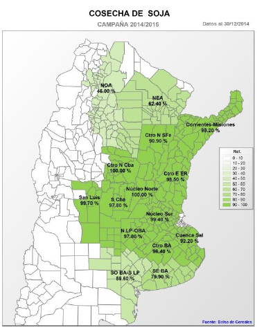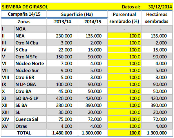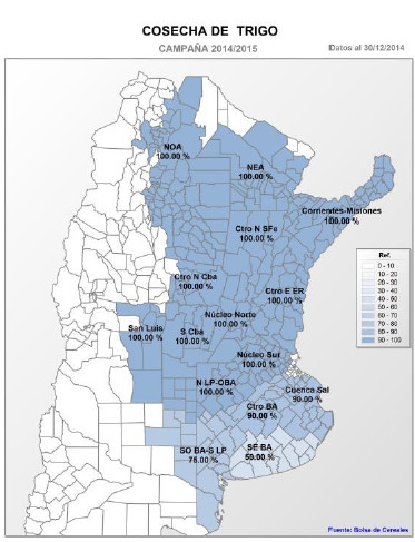 En la región Núcleo Sur se da por finalizada la campaña, cerrando el ciclo con un rinde medio de 35,8 qq/Ha, levemente por encima de la productividad media obtenida durante las trece campañas previas (rinde medio 01/02 al 13/14: 34,1 qq/Ha). En paralelo también finalizaron las recolecciones de lotes sobre el Norte de La Pampa-Oeste de Buenos Aires, en este caso cerrando el ciclo con un rinde medio de 38,1 qq/Ha.