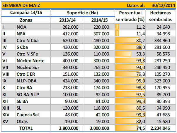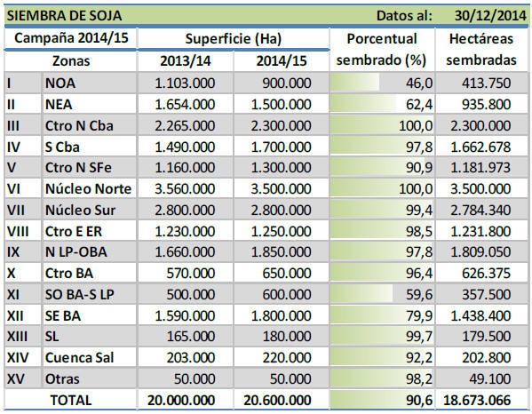 La siembra nacional logró cubrir el 74,5 % de una superficie proyectada para esta campaña en 3.000.000 , registrando un progreso intersemanal de 9 puntos porcentuales. En números absolutos se han sembrado hectáreasmás de 2,2 millones de hectáreas.