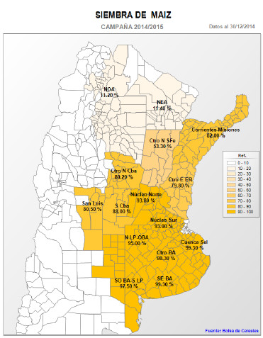 Por último, la zona Norte de La Pampa y Oeste de Buenos Aires presenta una gran heterogeneidad de condiciones en los maíces de siembras tempranas, dado que hacia el oeste bonaerense las condiciones van de excelentes a muy buenas, y comienzan a desmejorar a medida que nos vamos adentrando a la provincia de La Pampa. Esto se debe a las condiciones hídricas que presentan los perfiles en cada zona.