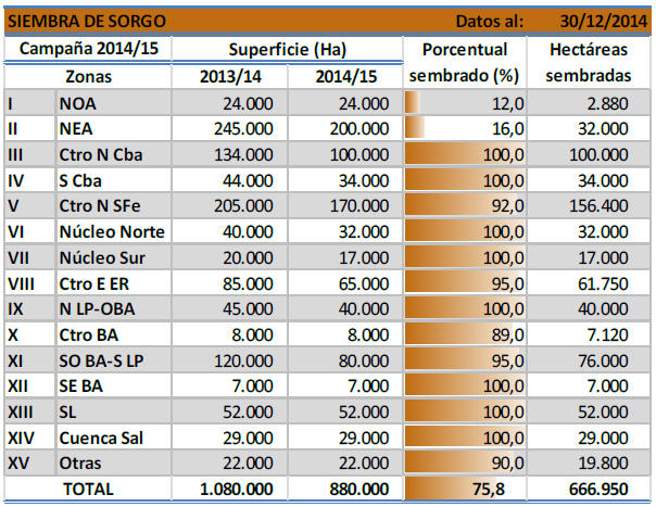 Avanzan las labores de implantación de sorgo granífero. A la fecha se llevan implantadas 667.000 hectáreas, representando un 75,8 % de la superficie nacional tentativamente estimada para esta campaña en 880.000 hectáreas. El avance quincenal fue de 17,8 puntos porcentuales, mientras que el retraso interanual se calcula en 0,7 puntos. Los cuadros implantados en fechas tempranas se encuentran en buenas condiciones, a excepción de las siembras del Sur de Córdoba, las cuales sufrieron por falta de agua durante estadíos tempranos.