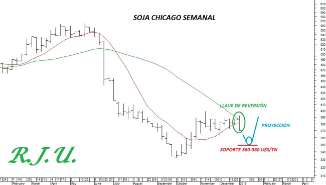 La soja inició el año 2015 con una fuerte caída en el precio, tanto en el mercado de Chicago como en el mercado loca, profundizando las pérdidas de finales de año y confirmando una señal técnica de reversión de tendencia en vista a las próximas semanas.